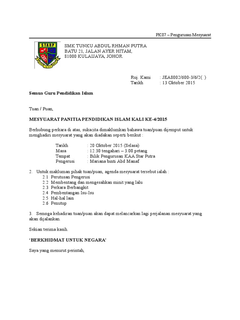 Contoh Surat Panggilan Mesyuarat Panitia Letter 7saudara Com