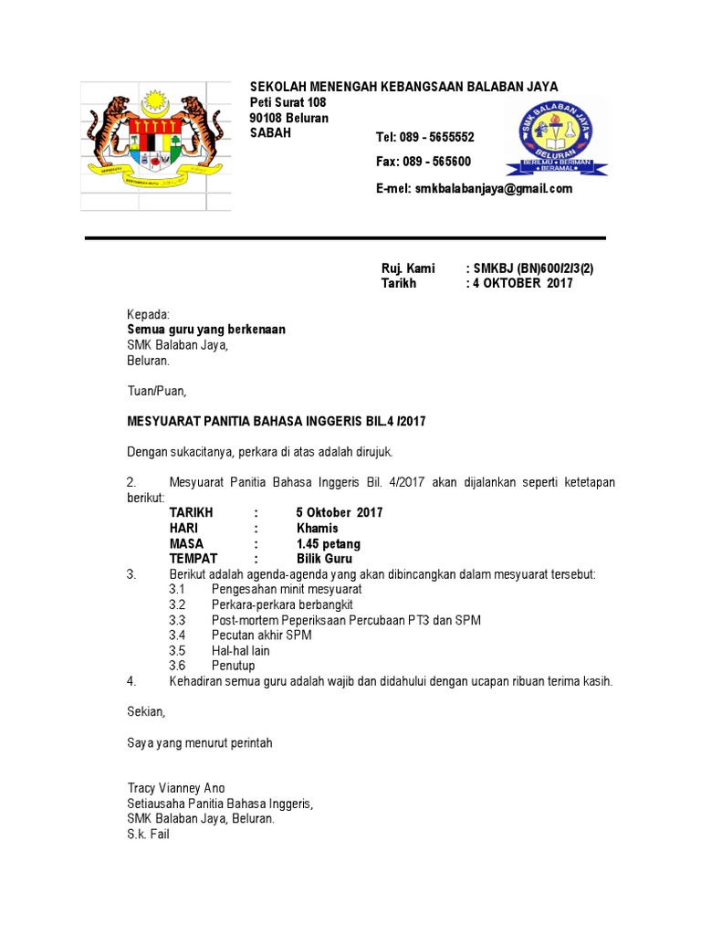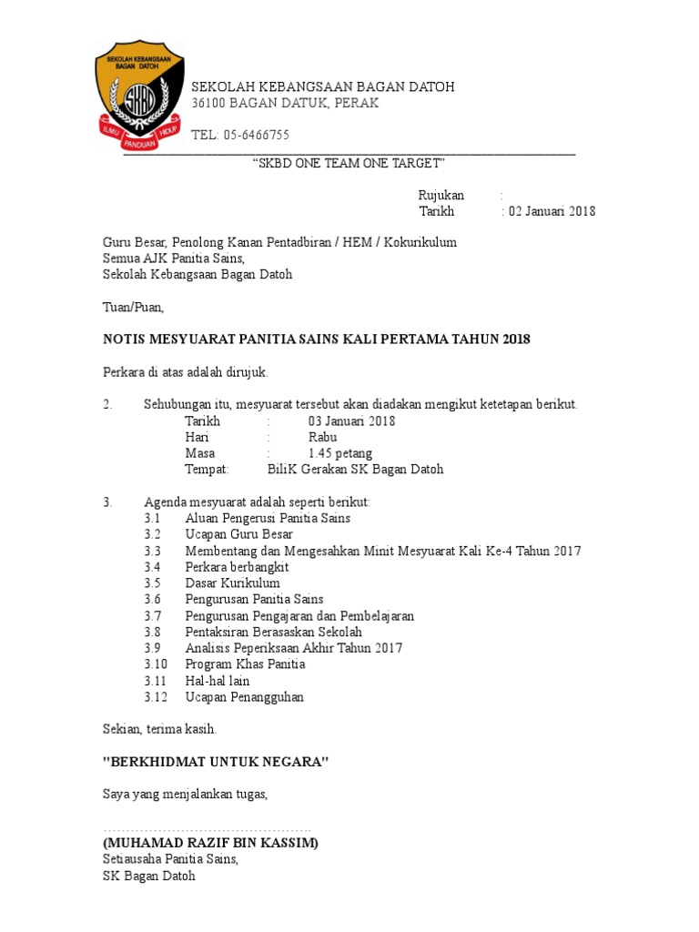 Surat Panggilan Mesyuarat Panitia Sains Pdf
